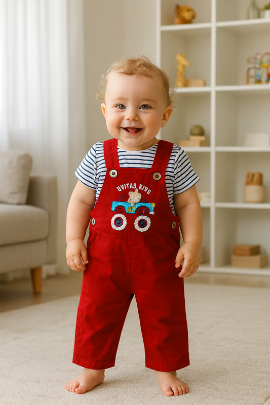 Overol bordado con camiseta a rayas para niño