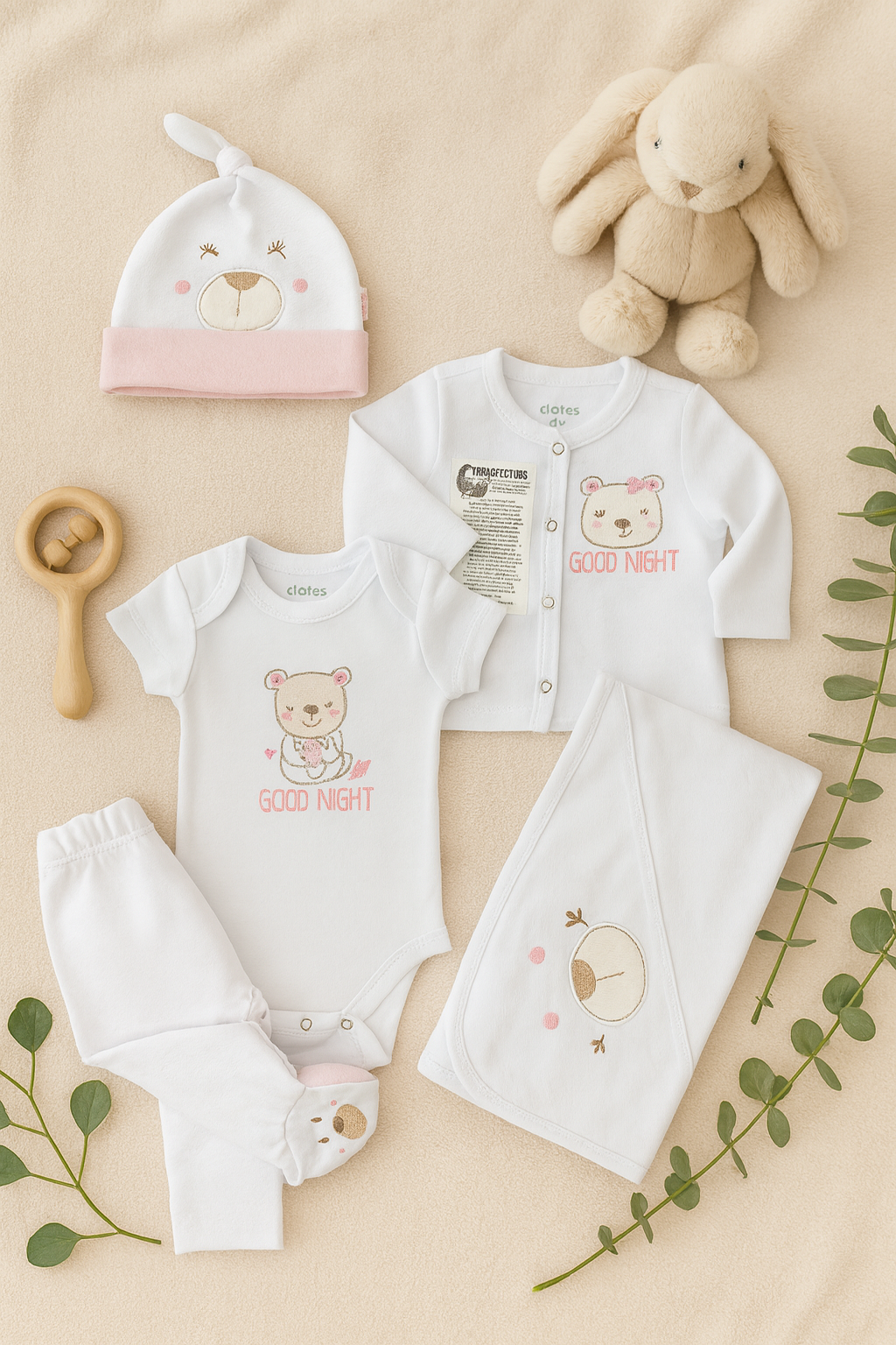 - Incluye: Saquito, body, pantalón, gorrito y manta
